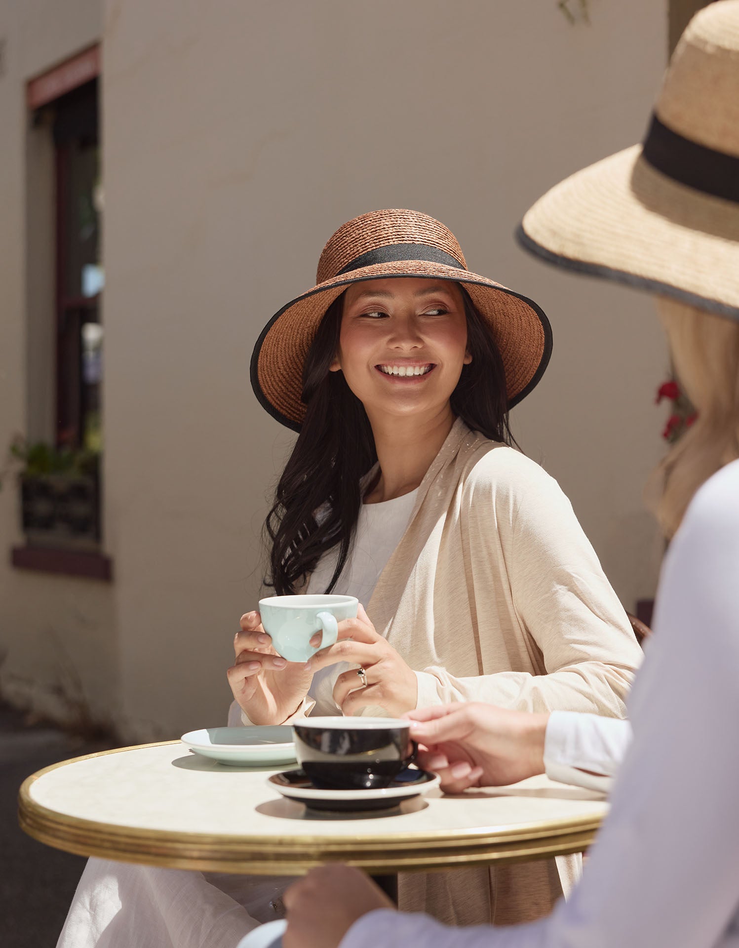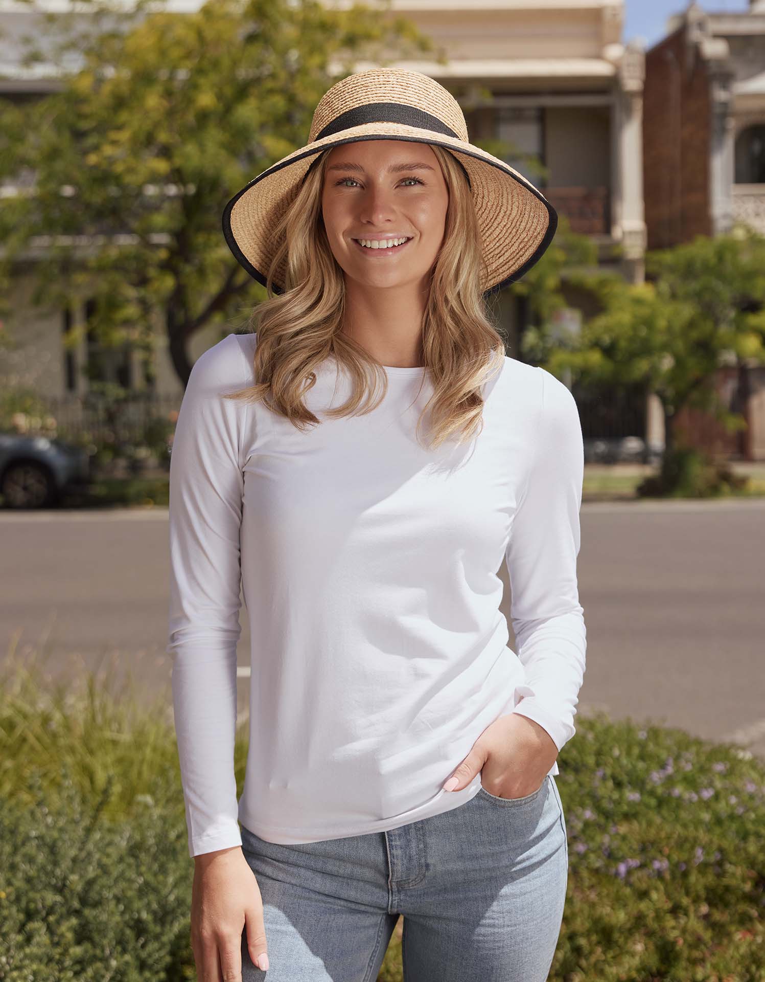 A woman wearing a natural coloured raffia sun hat.