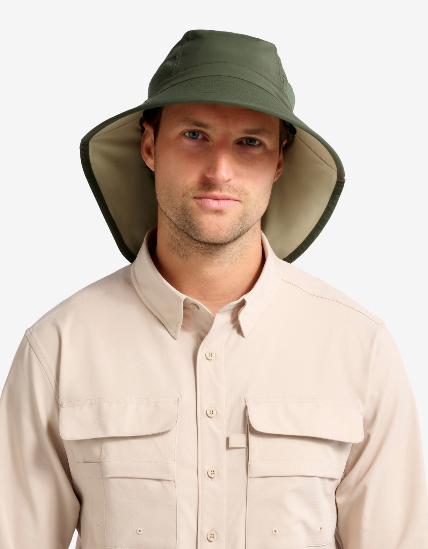Built for outdoor adventures, the Trekker Sun Hat features a legionnaire-style design that offers coverage for the neck, face, and ears. With a 3.5" (9 cm) brim and 6.75" (17 cm) neck cape, it offers reliable sun protection. Lightweight and breathable, it features a moisture-wicking sweatband, chin strap, and ventilated panels, making it a great choice for sun-safe activities..