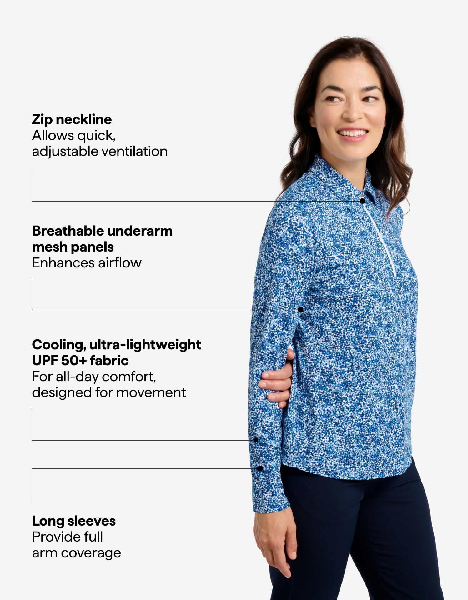 Featuring our Summer Floral print, it adds a fresh, feminine touch to your sun-safe style. The added collar offers extra neck protection, while underarm mesh enhances breathability. A sleek zip neckline allows easy ventilation and a modern look, perfect from the golf course to the trail.